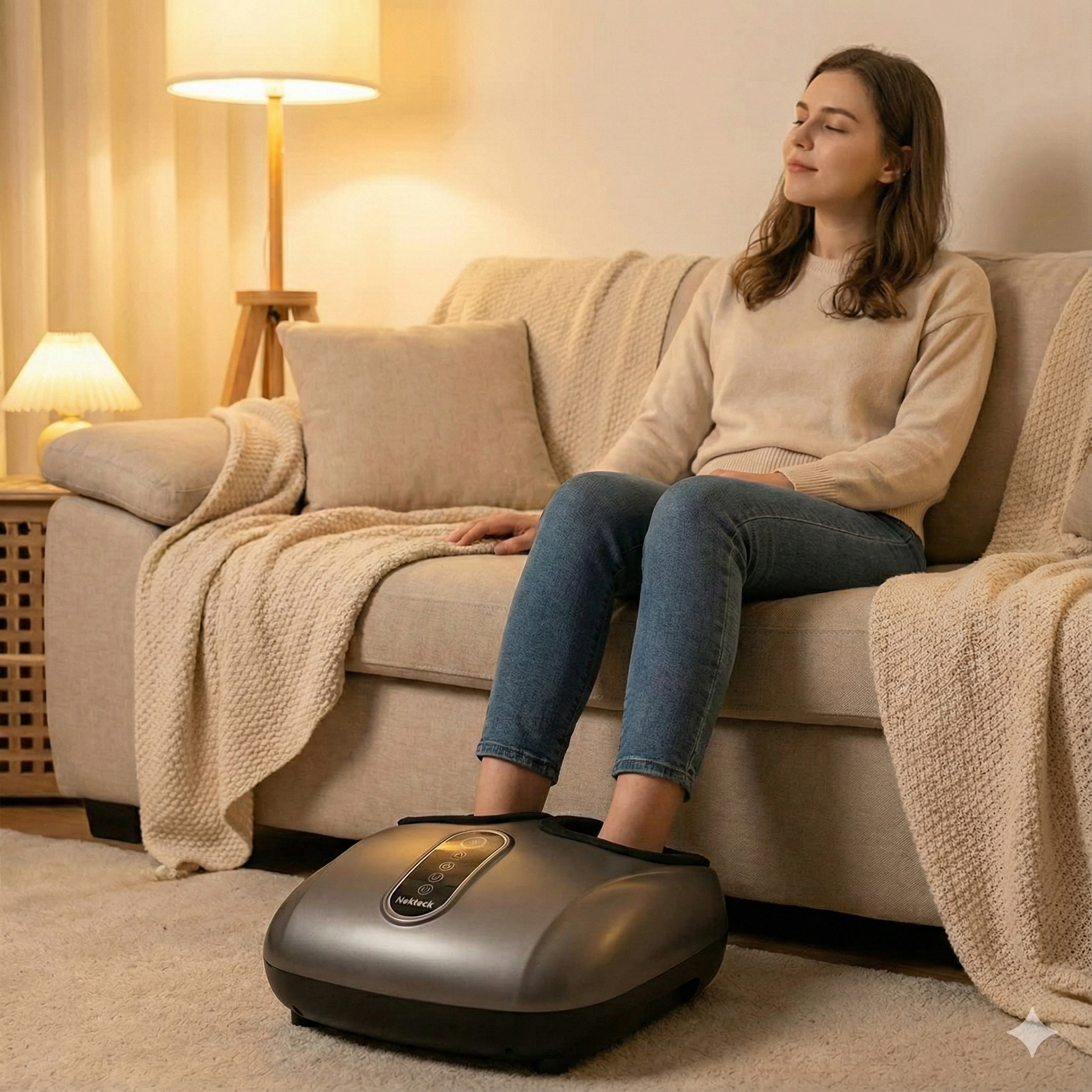 Relax your feet with a deep massage and comforting warmth from home